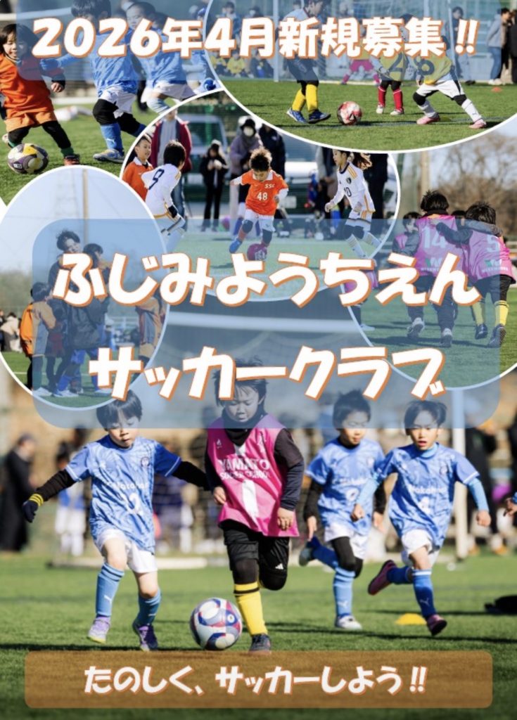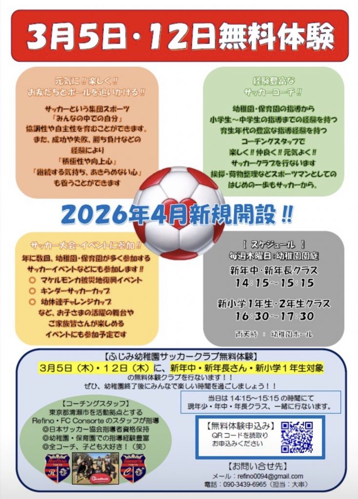 2026年4月新規開設する清瀬市ふじみ幼稚園サッカークラブの無料体験会のご案内です。