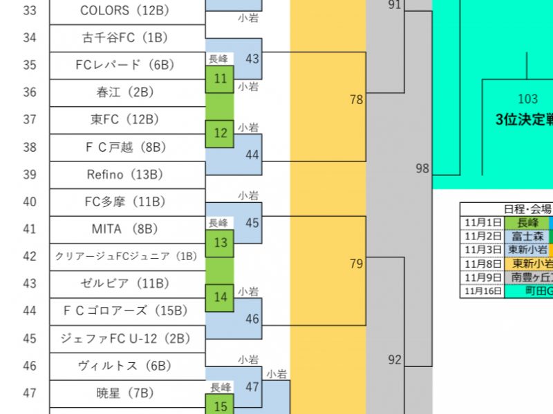 JFA第49回全日本 U12サッカー選手権大会 東京都中央大会(104チーム参加)の組合せが決まりました。11月1日〜16日まで、東京都内グラウンドにて開催、決勝は、町田GIONスタジアム Refi …